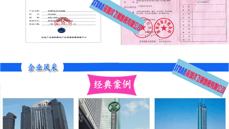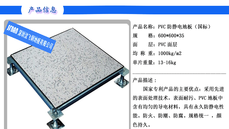 PVC全鋼高架地板 產(chǎn)品型號: 2.00MMPVC全鋼高架地板 規(guī)格: 600×600×35㎜ 產(chǎn)品說明: 永久性防靜電PVC地板是一種彈性均質(zhì)的氯乙烯地面材料,其內(nèi)部的PVC顆粒表面有一層導(dǎo)...